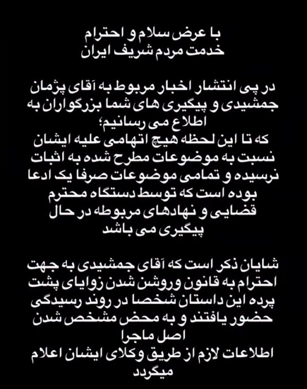 «برخی ادعاها درباره گزارش پزشکی قانونی یا سابقه مشابه جمشیدی نادرست و قابل پیگرد است. ما از قانون تمکین میکنیم و منتظر رأی قطعی هستیم. تا این مرحله، اتهام تجاوز وارد نیست و دفاعیات در موعد مقرر ارائه میشود.»