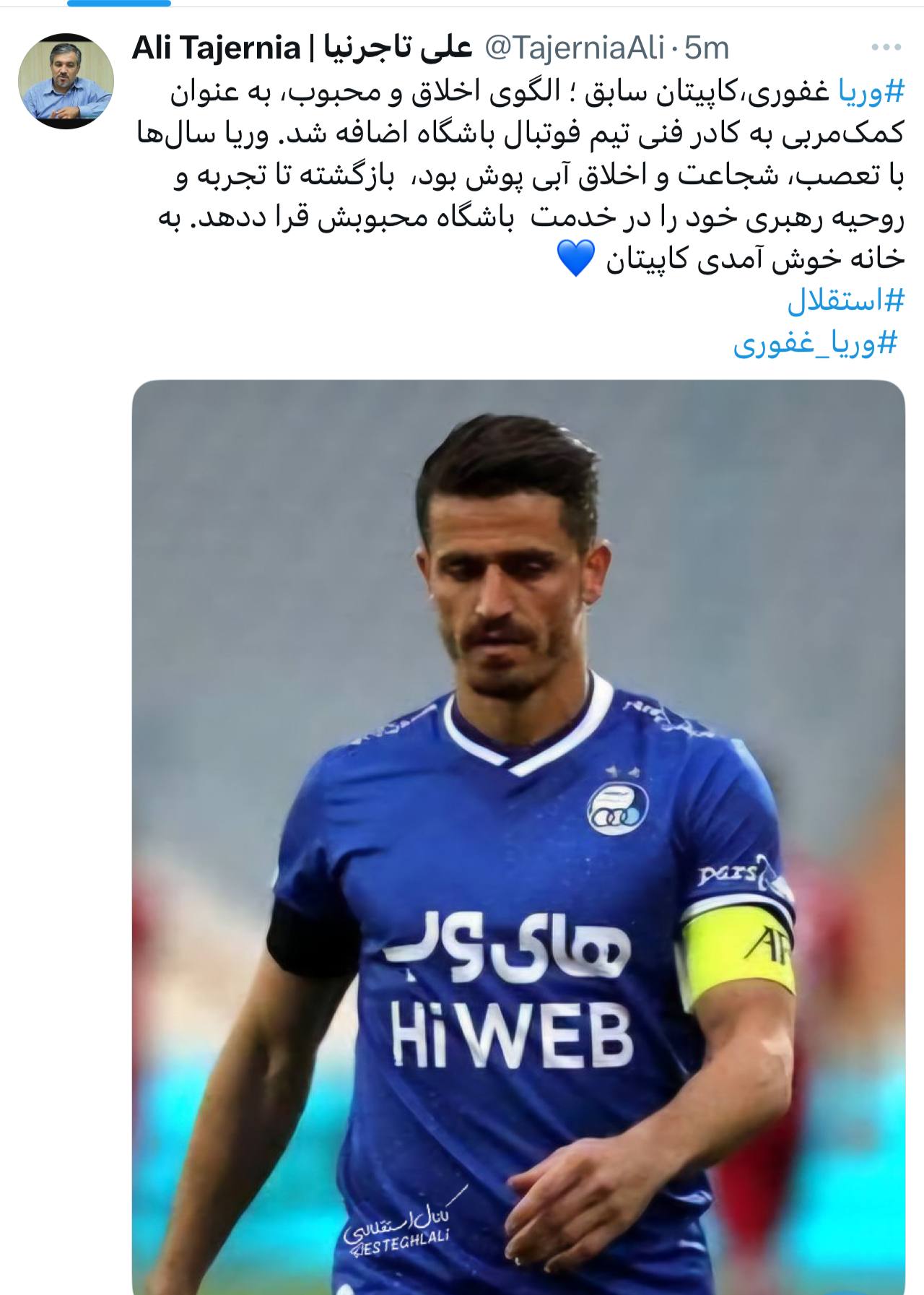 «وریا غفوری، کاپیتان سابق؛ الگوی اخلاق و محبوب، به عنوان کمکمربی به کادر فنی تیم فوتبال باشگاه اضافه شد. وریا سالها با تعصب، شجاعت و اخلاق آبیپوش بود و حالا بازگشته تا تجربه و روحیه رهبری خود را در خدمت باشگاه محبوبش قرار دهد. به خانه خوش آمدی کاپیتان!»